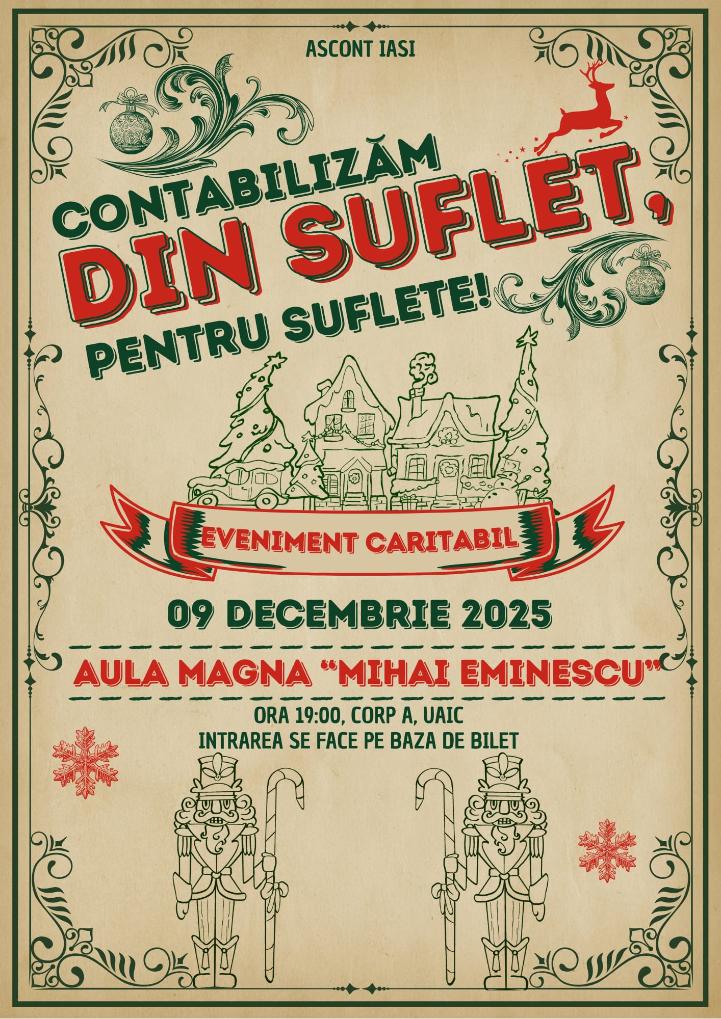 Prin acest eveniment ne dorim să îi fim alături și să contribuim la acoperirea cheltuielilor medicale. Cu sprijinul comunității, putem aduce un strop de lumină în viața lui Mateo, mai ales în apropierea sărbătorilor. Vă așteptăm cu drag pe 9 decembrie 2025 la un spectacol de Crăciun susținut de artiști locali, organizat pentru strângerea de fonduri care să îl ajute pe Mateo în lupta sa. Participarea se face pe baza unui bilet care poate fi achiziționat de la voluntarii prezenți în facultate sau prin contactarea asociației pe rețelele sociale. Dacă nu puteți fi prezenți, dar doriți să contribuiți, donațiile pot fi făcute în contul asociației: Titular cont: Asociația Studenților Contabili din Iași IBAN: RO27BRDE240SV23606312400 Detalii plată: Contribuție eveniment caritabil pentru Mateo Orice donație, oricât de mică, contează. Împreună putem aduce speranță în viața lui Mateo și putem arăta că adevăratul spirit al sărbătorilor înseamnă solidaritate, bunătate și inimă deschisă.