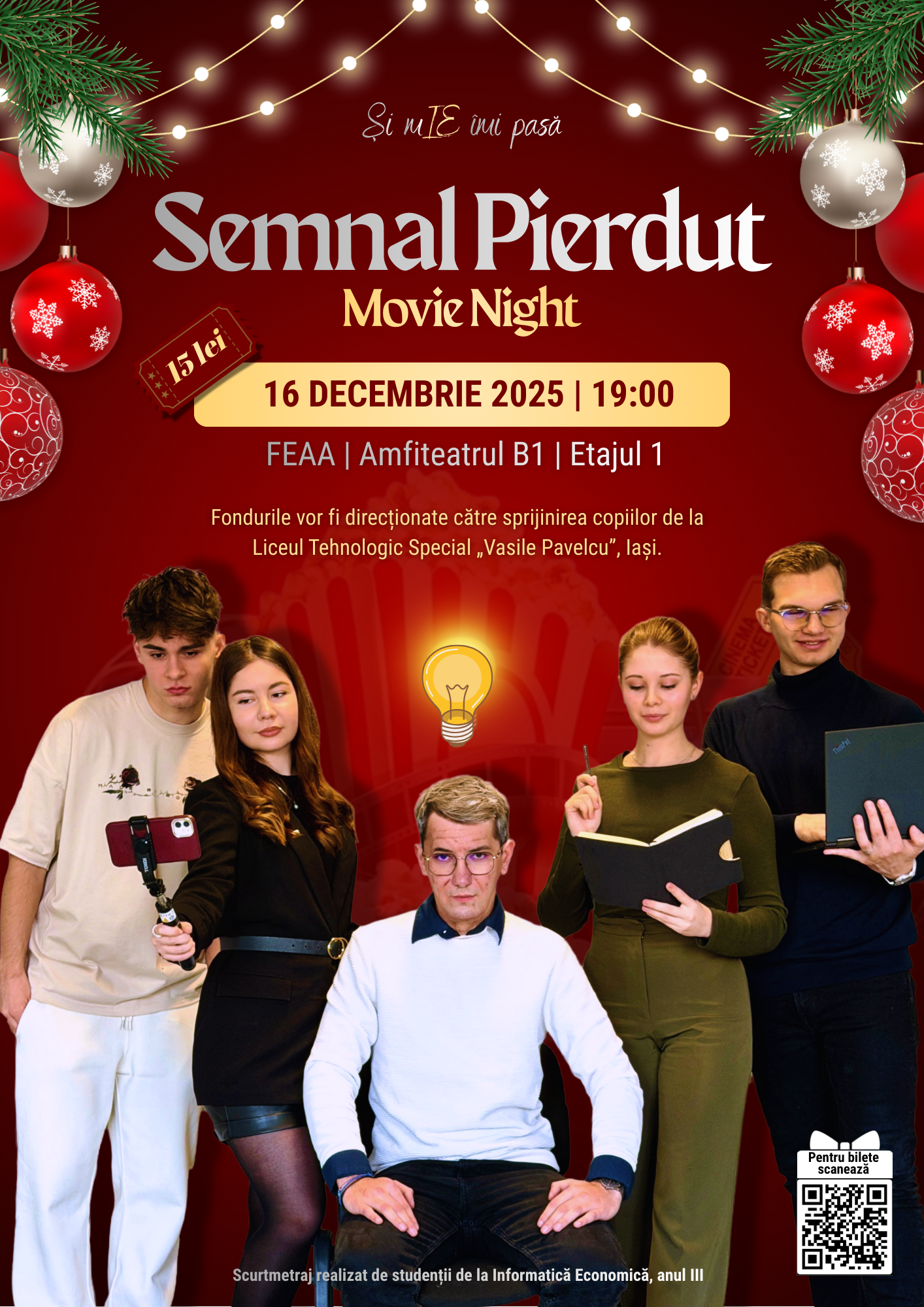 | ✨ Te invităm pe 16 decembrie 2025, începând cu ora 19:00, la FEAA - Amfiteatrul B1, la o seară de film caritabilă! 🎥 Vom viziona scurtmetrajul realizat de noi, studenții de la Informatică Economică, într-o atmosferă plină de magie și voie bună. 🍿 În cadrul evenimentului veți găsi și un mic târg cu produse handmade, gustări delicioase și o zonă foto special amenajată, cu fotograf profesionist. 🎁 Toate fondurile strânse vor sprijini 80 de copii de la Liceul Tehnologic Special „Vasile Pavelcu” din Iași. 🎟️ Bilete: • 15 lei – până în ziua evenimentului • 20 lei – în ziua evenimentului și la intrare Achiziționând un bilet, participați automat la o tombolă cu premii oferite de sponsorii noștri. Pentru achiziționare, ne puteți contacta prin mesaj privat pe rețelele sociale (accesând link-ul de mai jos) sau la numărul: 📞 +40 (750) 275 068 – Irina ❤️ Hai să facem bine. Împreună. Mai multe detalii sunt disponibile aici