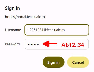 - Username: matricol@feaa.uaic.ro (in our case, 310440601RSL181158@feaa.uaic.ro)